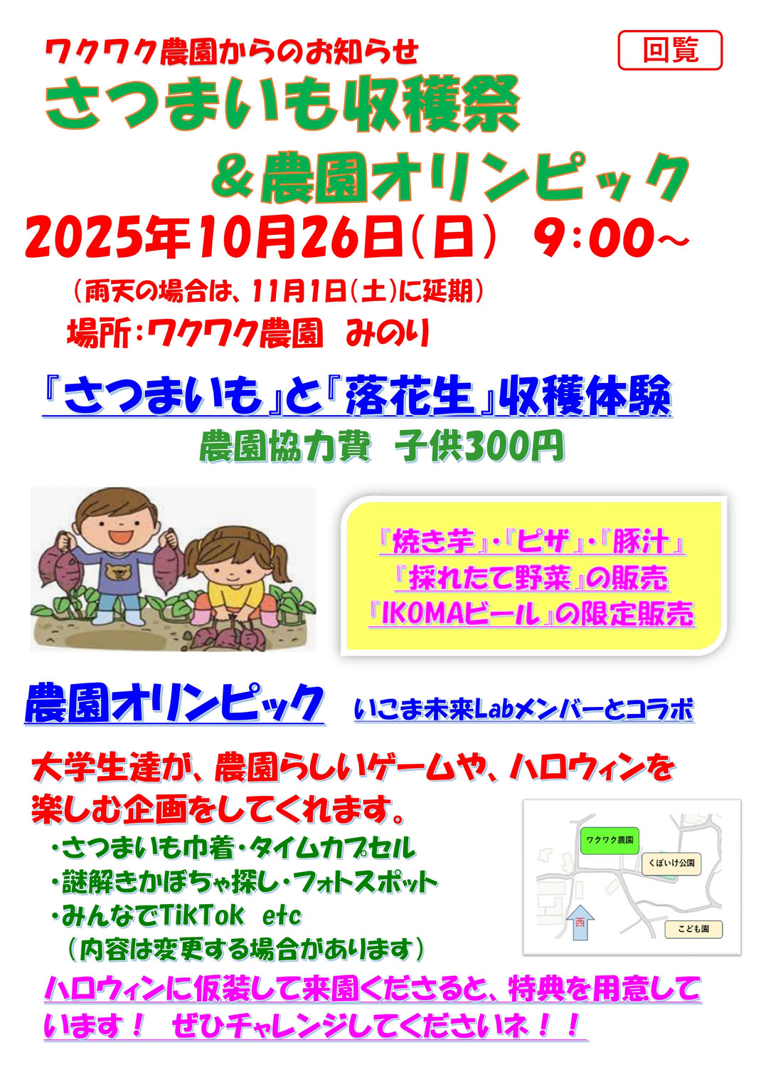 今日は待ちに待ったサツマイモ🍠収穫祭です。 今年で2回目となりますが、去年より沢山の方々が来て頂きました。 焼き芋や採りたて野菜、コロッケ、シホンケーキは開園半ばで早くも売切れ続出😋生駒市からの移動図書館も人気だったよ! 皆さんお買上げ有難うございました♪